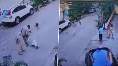 அவரை ஐந்து நாய்கள் சுற்றிய போது, ஒரு கணம் அவர் அதிர்ந்தும் போனார். இந்த அதிர்ச்சி காட்சிகள் அங்கிருந்த கேமிராவில் பதிவாகி இருக்கின்றன.