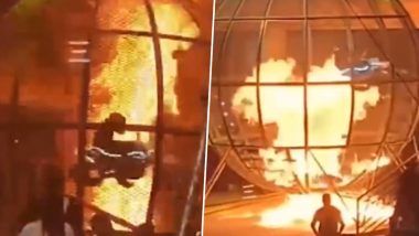 அடுத்த நொடியே வாகனம் தீப்பிடித்து எரிய, அதனை இயக்கியவரும் தீயின் பிடியில் சிக்கிக்கொண்டார். இதனைக்கண்டு அதிர்ந்துபோன பார்வையாளர்கள் என்ன செய்வது என்று தெரியாமல் விழிபிதுங்கினர். World Best Whiskey Awards 2023: உலகளவில் மிகச்சிறந்த விஸ்கியாக தேர்வு செய்யப்பட்டது, இந்தியாவின் "இந்த்ரி" விஸ்கி..!
