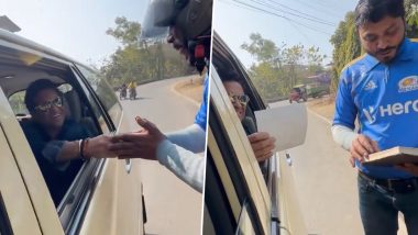 ரசிகருக்கு இன்ப அதிர்ச்சி கொடுத்த சச்சின்: மொத்தமாக 664 சர்வதேச அளவிலான கிரிக்கெட் போட்டிகளில் விளையாடியுள்ள சச்சின் தெண்டுல்கர், 34,357 ரன்களை குவித்து இருக்கிறார். பிற போட்டிகளை கணக்கில் எடுத்துக்கொண்டால் ரன்கள் மற்றும் போட்டிகளின் எண்ணிக்கை இன்னும் இரண்டு மடங்கு அதிகரிக்கும். எளிமையான குணம் கொண்ட சச்சின், அவ்வப்போது பொதுவெளிகளில் தனது மனதின் குரலை வெளிப்படுத்துவது வழக்கம். இந்நிலையில், சச்சின் தெண்டுல்கர் காரில் பயணம் செய்யும்போது, அவரின் ரசிகர் ஒருவர் இருசக்கர வாகனத்தில் சச்சின் டீ-சர்ட் அணிந்து பயணம் செய்தார். இதனைக்கண்ட சச்சின் ரசிகரை நிறுத்தி இன்ப அதிர்ச்சி கொடுத்து கலந்துரையாடினார். இதனை சற்றும் எதிர்பாராத ரசிகர், பிரம்மிப்பில் வியந்தபடி தனது நாயகனுடன் உரையாடி மகிழ்ந்தபடி அங்கிருந்து சென்றார்.